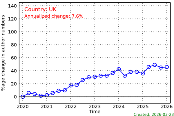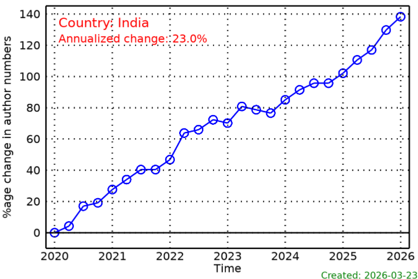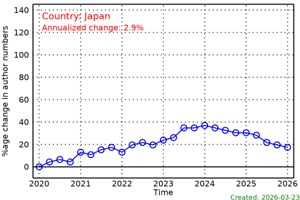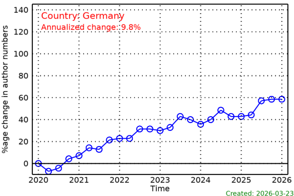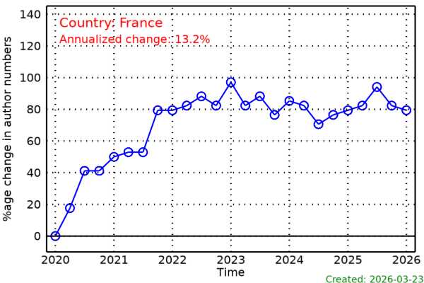 HelioTrends: author numbers for individual countriesThe plots below show the percentage change in HelioTrends authors numbers for the most populous countries. Only countries with at least 50 authors in the most recent HelioTrends file are shown. The Y-range for each plot is the same.
