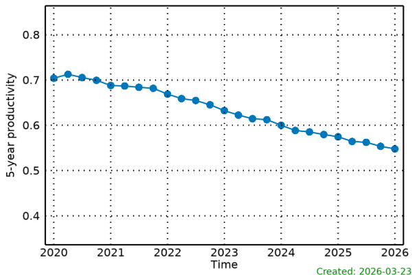 The plot below shows the 5-year productivities of early-career, mid-career and senior researchers. The grey line shows the 5-year productivity for all authors.
