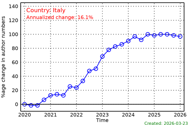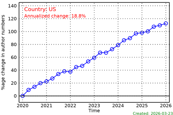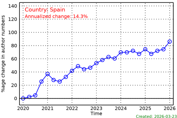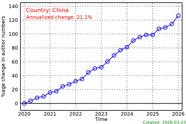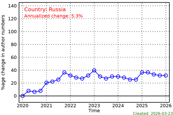 HelioTrends: author numbers for individual countriesThe plots below show the percentage change in HelioTrends authors numbers for the most populous countries. Only countries with at least 50 authors in the most recent HelioTrends file are shown. The Y-range for each plot is the same.