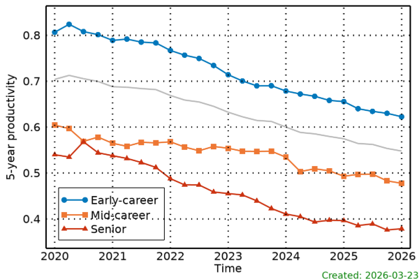 The plot below shows the 5-year productivities of early-career, mid-career and senior researchers. The grey line shows the 5-year productivity for all authors.