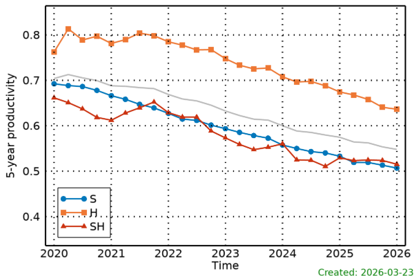 The plot below shows the 5-year productivities of solar (S), heliospheric (SH), and solar and heliospheric (SH) researchers. The grey line shows the 5-year productivity for all authors.